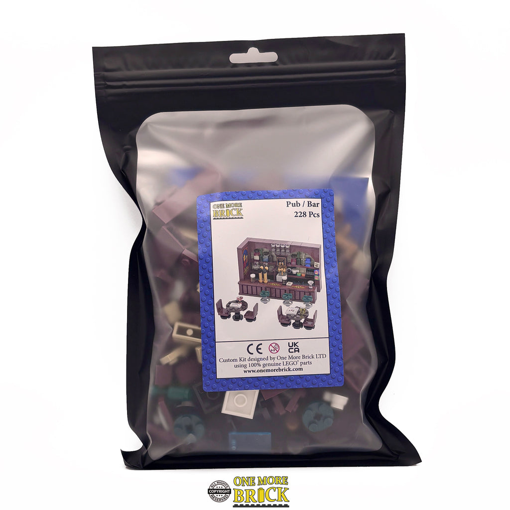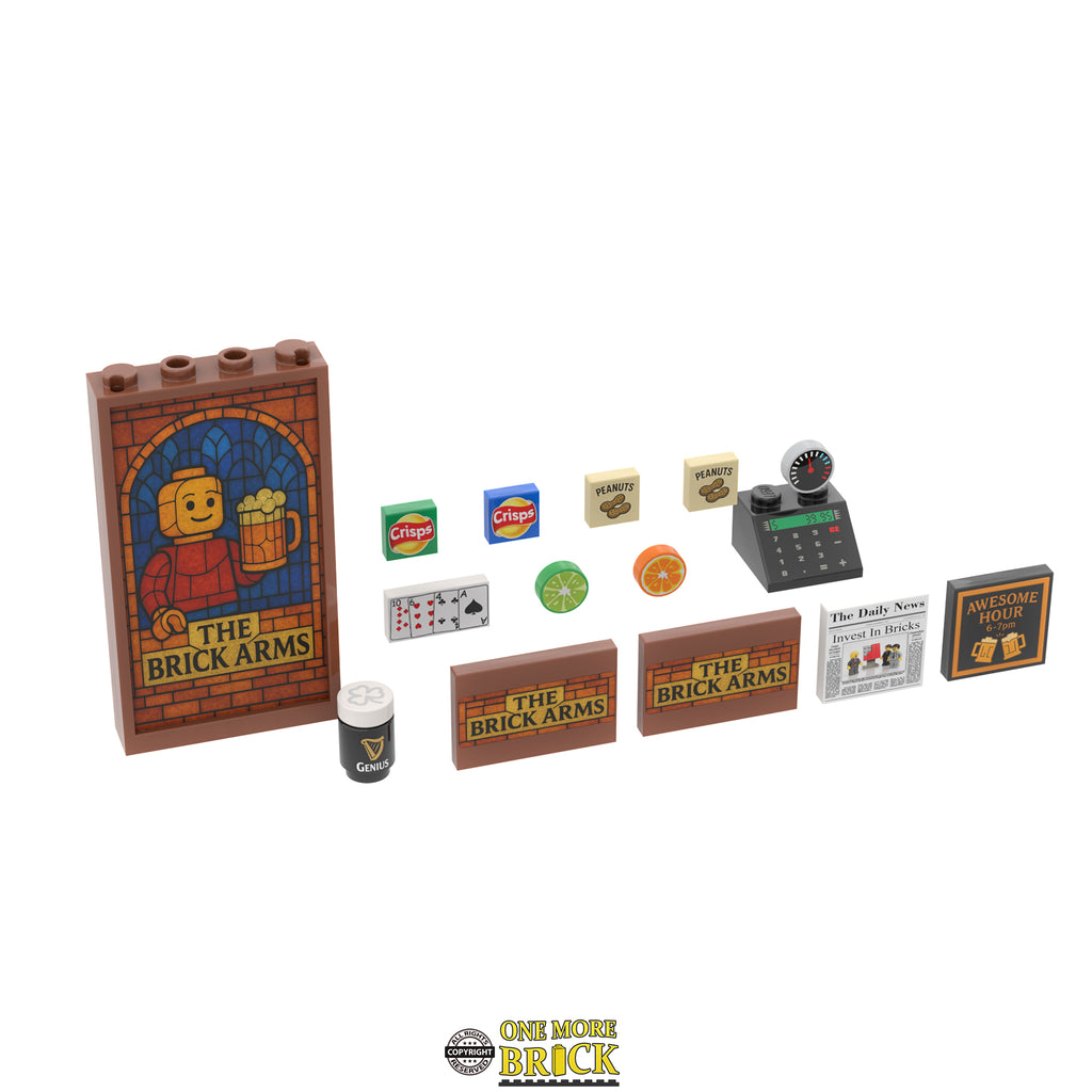 Includes 16 printed parts (13 custom custom printed) - Brick Arms window, Brick Arms beer mats, Crisps, Peanuts, Playing Cards, Guinness Pint, Newspaper and more.